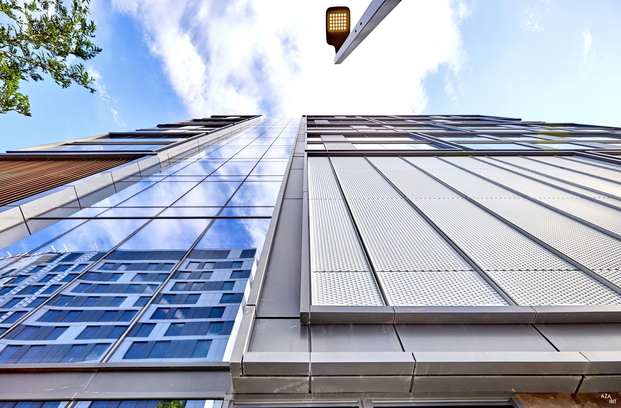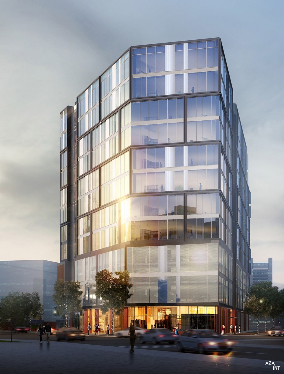 Designed by the architectural firm SGA, the building will rise alongside the approved Marine Wharf Hotel (a slightly shorter construction) and will feature commercial spaces on the ground floor, a public square of 12,100 Sq Ft fronting Drydock Avenue, and a 700 Sq Ft panoramic terrace.
